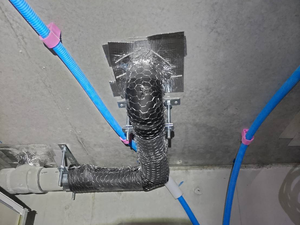 設備工事においての遮音工事とは、排水管の水の流れる音や、ダクトの風切音を遮音シートや、鉛などを用いて極力抑える、という事を主としています。